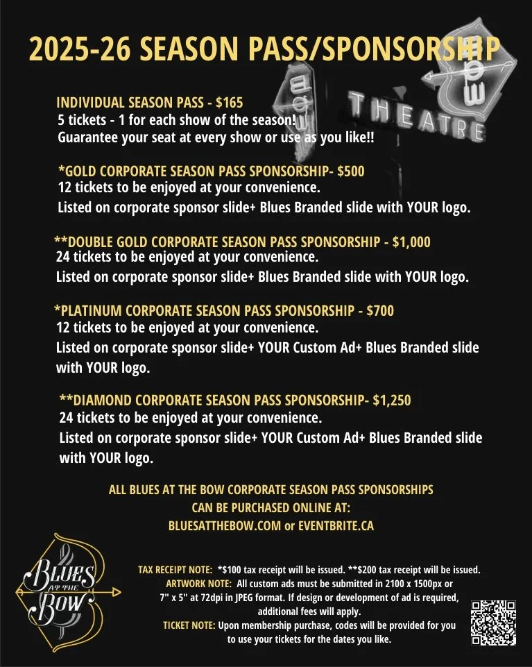 Thanks for considering a Season Pass with BLUES AT THE BOW. We are working on another incredible line-up of talented and award-winning blues artists, and we can’t wait to announce our upcoming shows for the year!